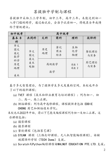 菩提独中采取三三学年制,初中三年,高中三年。未能达到初一