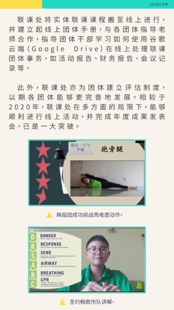 2022年1月号 联课处将实体联课课程搬至线上进行, 并建立起线上团体手册,与各团体指导老 师合作,指导团体干部学习如何使用谷歌 云端( Google Driv e )在线上处理联课 团 体 事 务,如 活 动 报 告、财 务 报 告、会 议 记 录 等。 此外,联课处亦为团体建立评估制度, 以期各团体能够更完善地发展 。 相较于 2020年,联课处在多方面的局限下,能够 顺利进行线上活动,并完成年度成果发表 会,已是一大突破。 舞蹈团成功挑战高难度动作。 圣约翰救伤队讲解。
