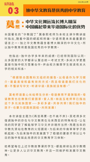 本国著名的“ 华教园丁 ”莫泰熙老师为本校主讲华教讲座