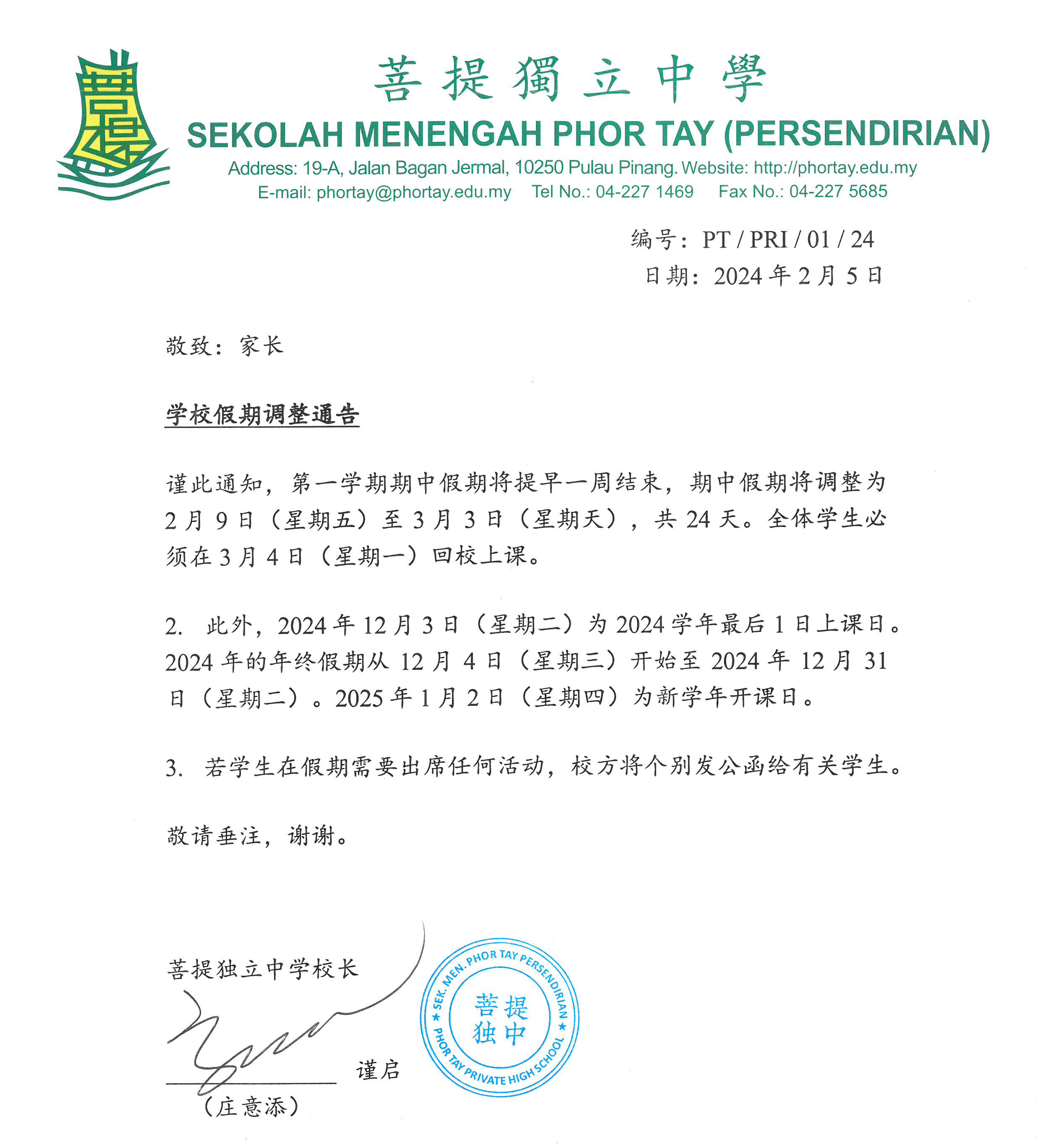 学校假期调整通告