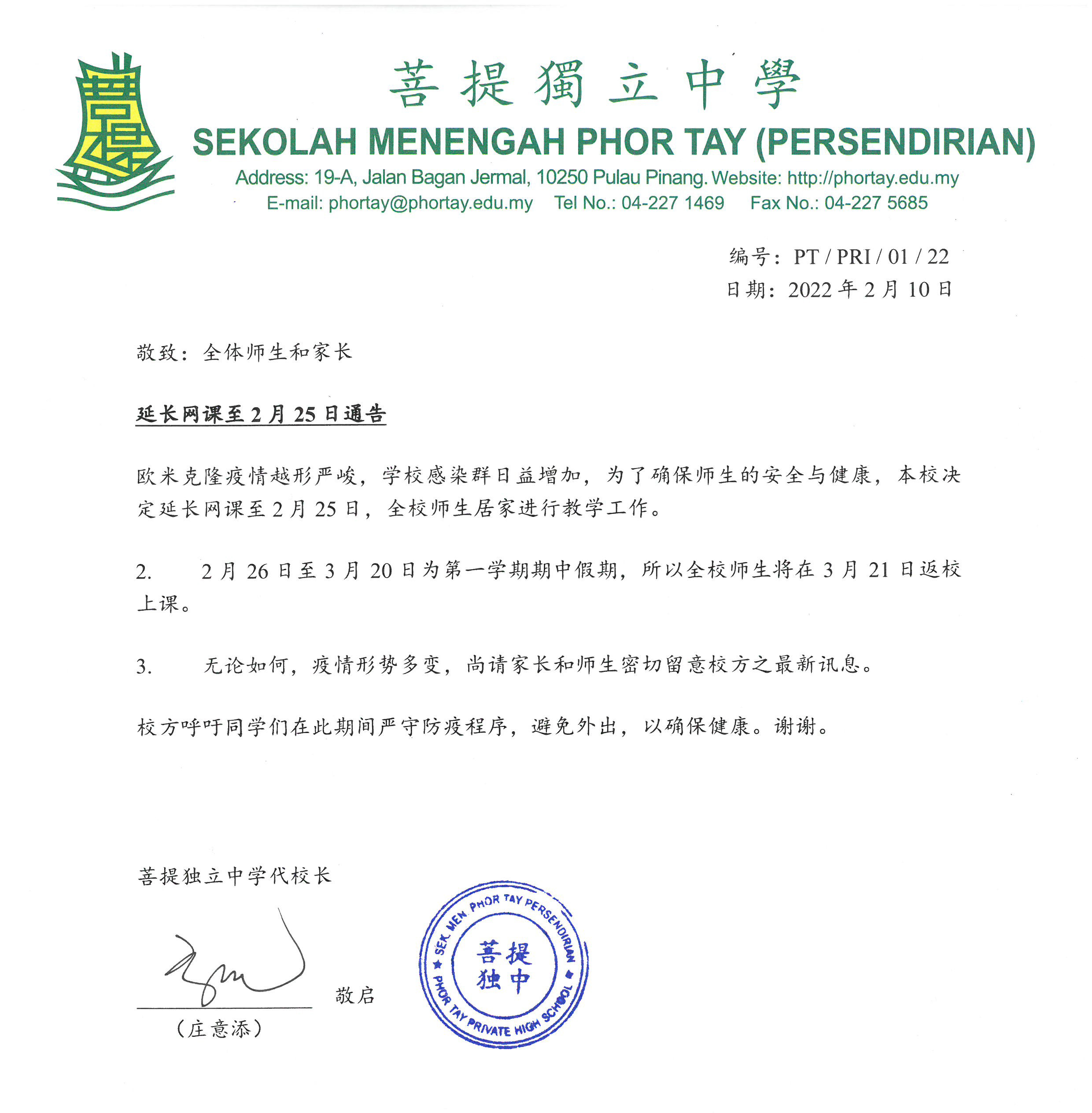 欧米克隆疫情越形严峻,学校感染群日益增加,今日确诊数量更高达近两万人。为了确保师生的安全与健康,本校决定延长网课至2月25日,全校师生在此期间居家进行教学工作。