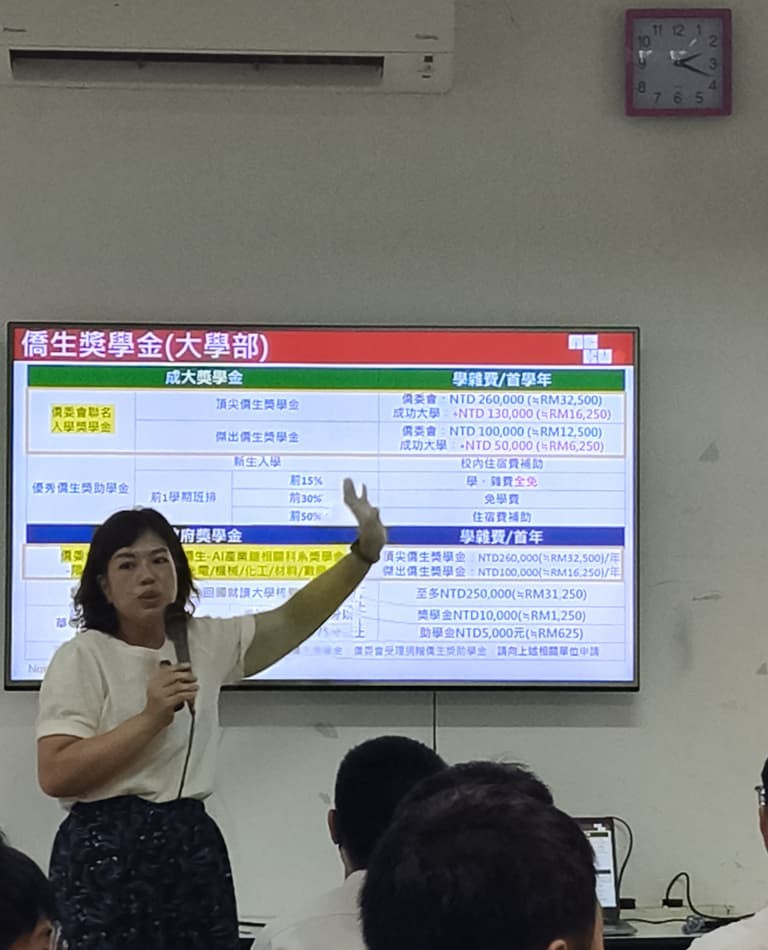 为协助学生掌握最新赴台升学资讯,本校辅导处于3月12日在小礼堂举办台湾国立成功大学(NCKU)升学宣讲会,并邀请成大境外生招生组资深经理李菀君及学生助理钱乐瑶主讲,为欲前往台湾留学的学生指点迷津。
