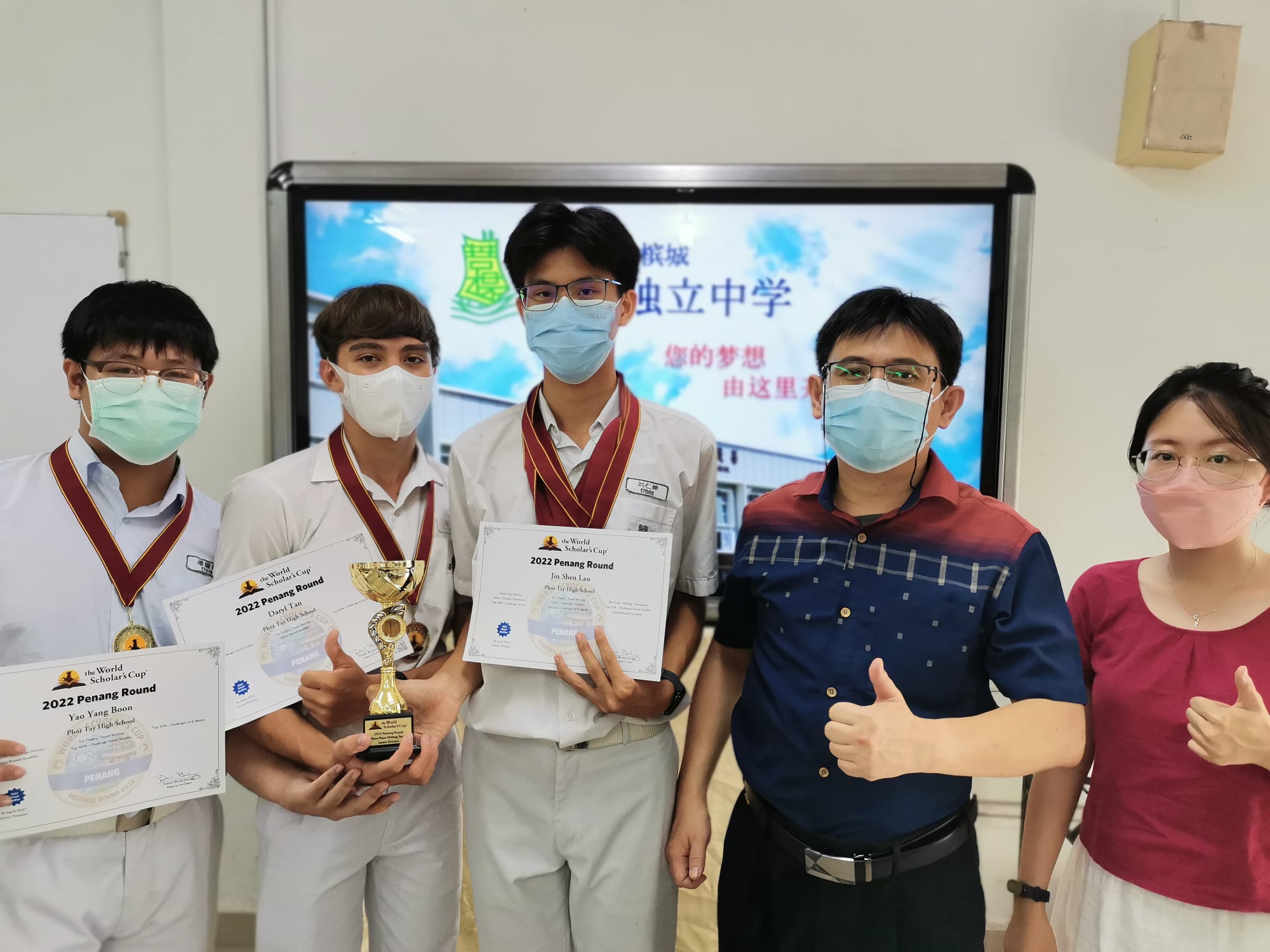 本校高三学生刘仁绅,陈京谦和潘耀扬参与2022年度世界学者杯(槟城赛区)比赛,表现优异,荣获协同创作(Collaborative Writing)小组赛第三名,获得晋级在曼谷举办的赛事次圈。