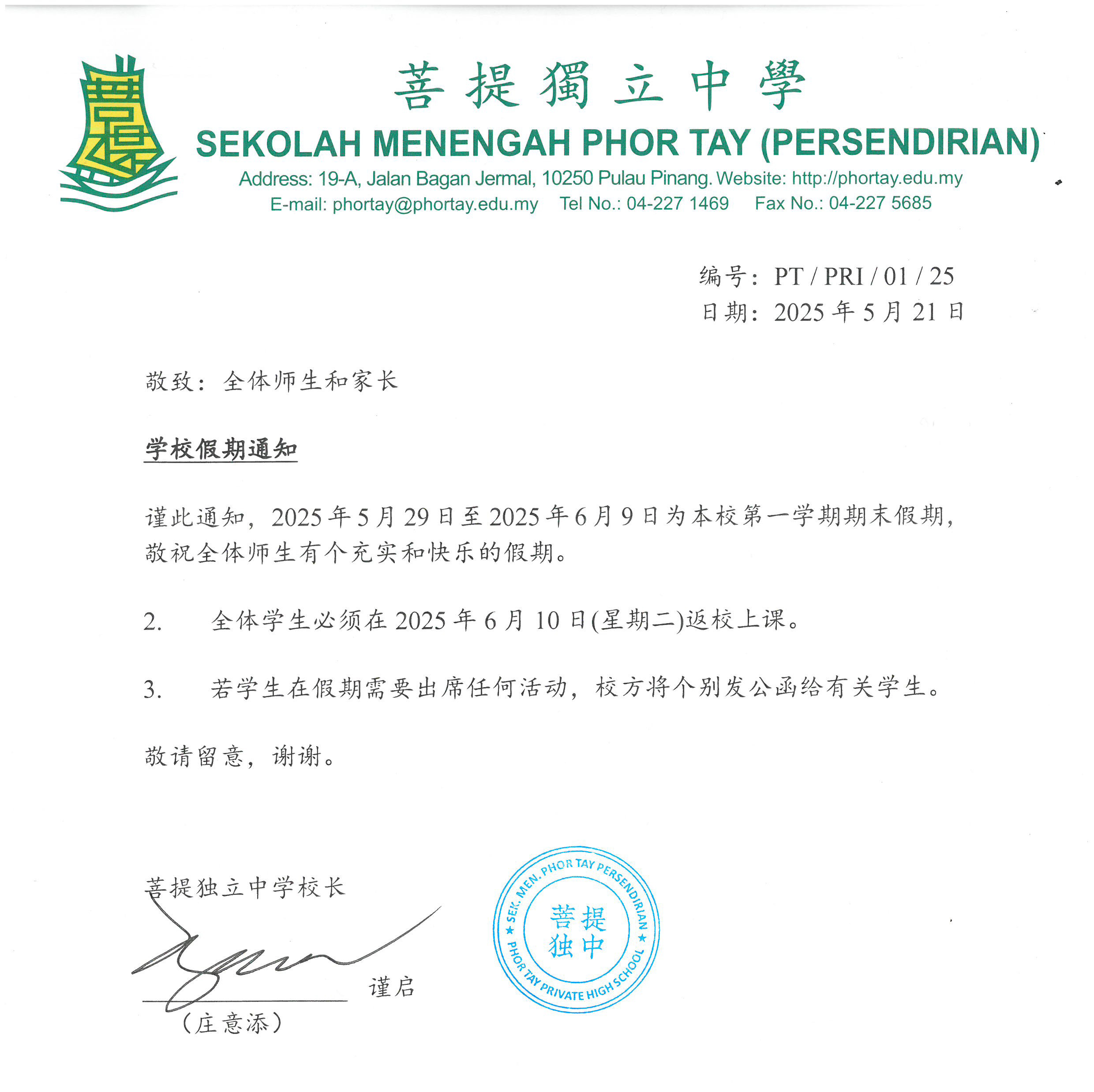 学校假期通知