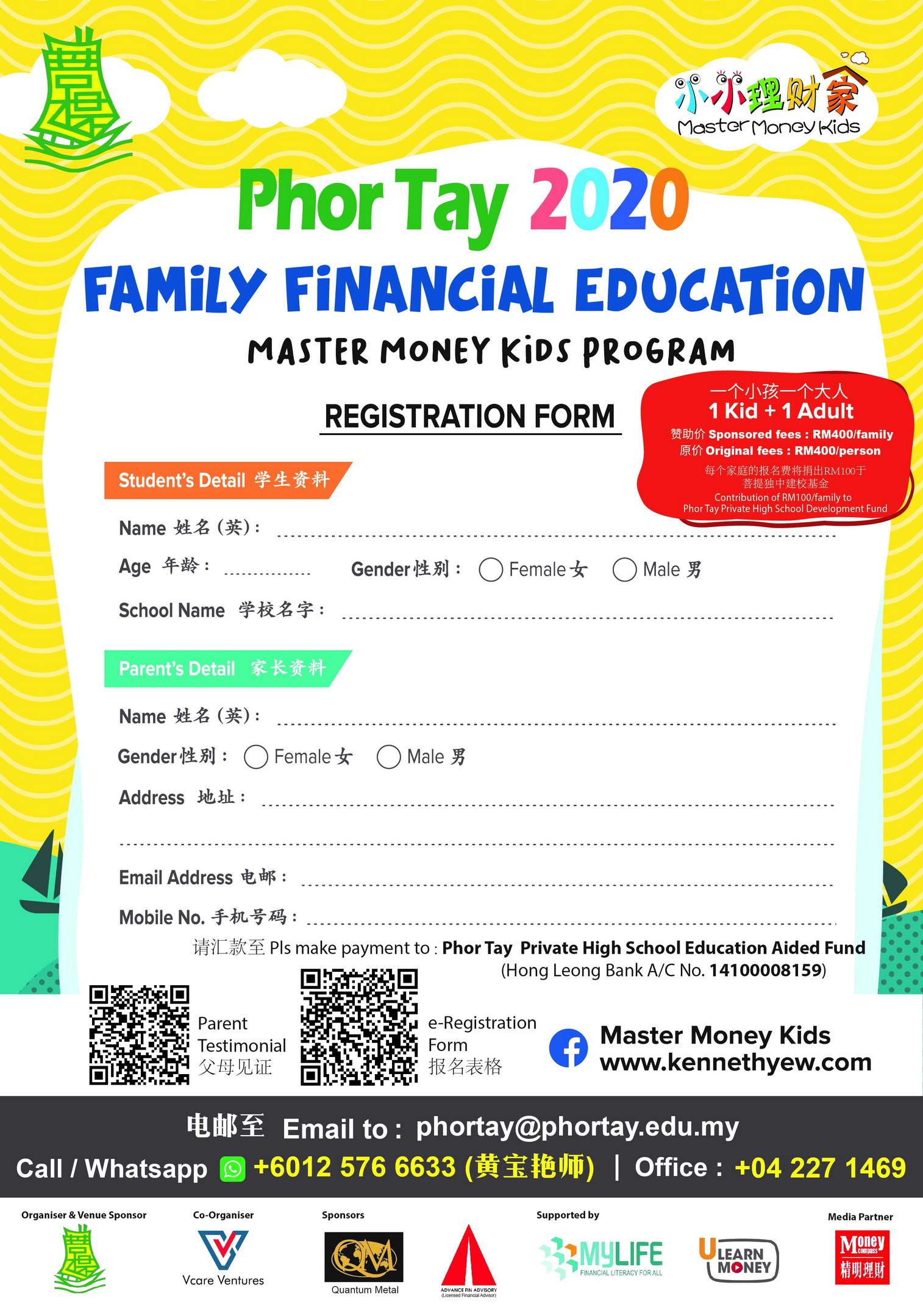 *每个家庭的報名费中,《小小理财家》将捐献 RM100 给本校菩提独中作为建校基金