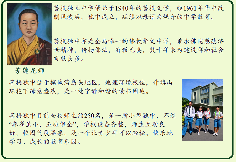 菩提独中亦是全马唯一的佛教华文中学,秉承佛陀慈悲济世精神,传扬佛法,有教无类,数十年来为建设祥和社会贡献良多。