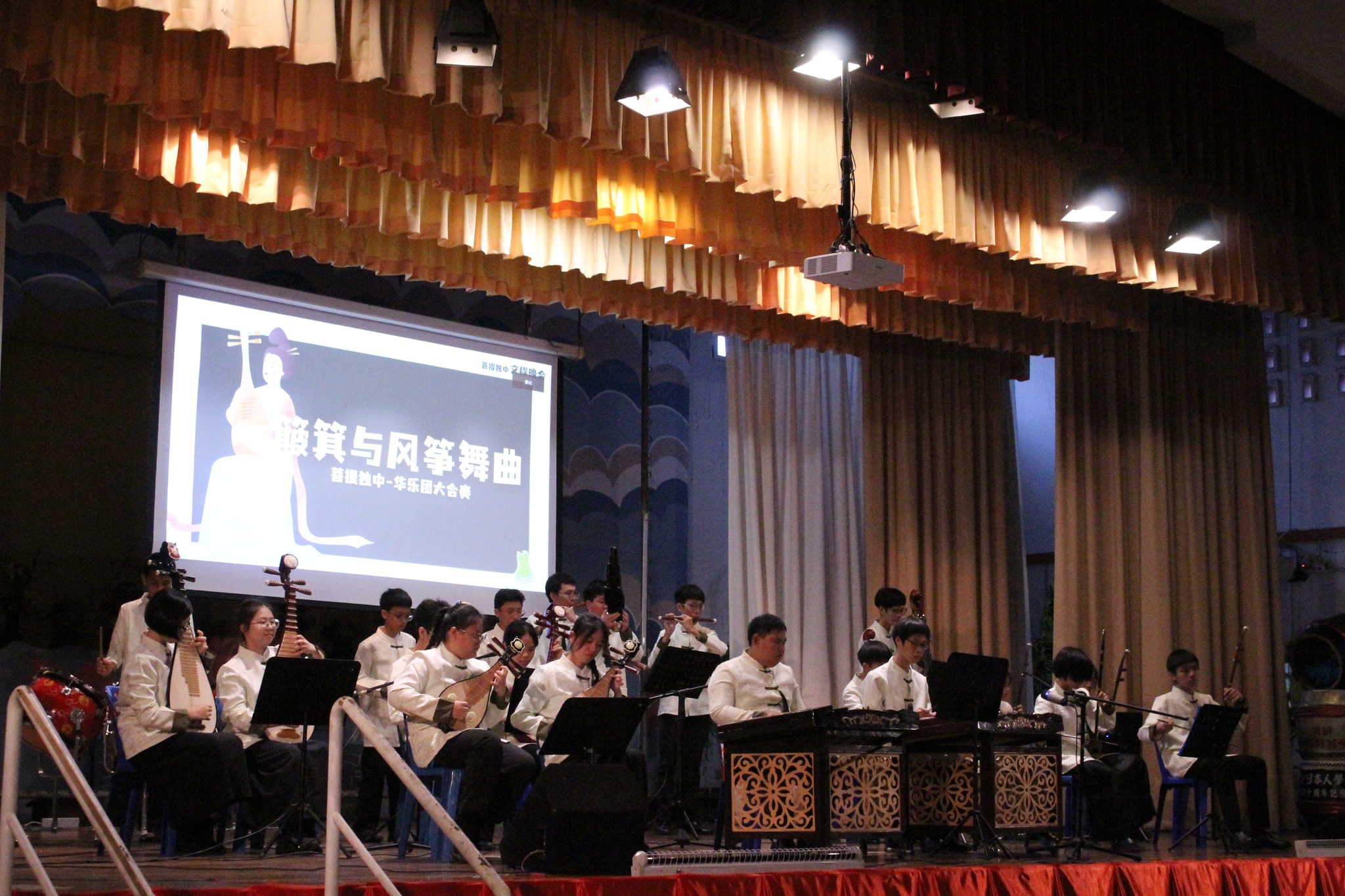 晚会首由华乐合奏掀开序幕,一首改编自吉兰丹马来民歌的《簸箕与风筝舞曲》描绘出我国秀丽的乡村风光。此外更有华乐独奏,颜均丞同学的《阿美族舞曲》,以悠扬的二胡声奏出阿美族载歌载舞的场景;蒋承余同学的《定风波》,凭着清越幽远的古筝弦音,将苏轼飘逸洒脱表现得淋漓尽致。