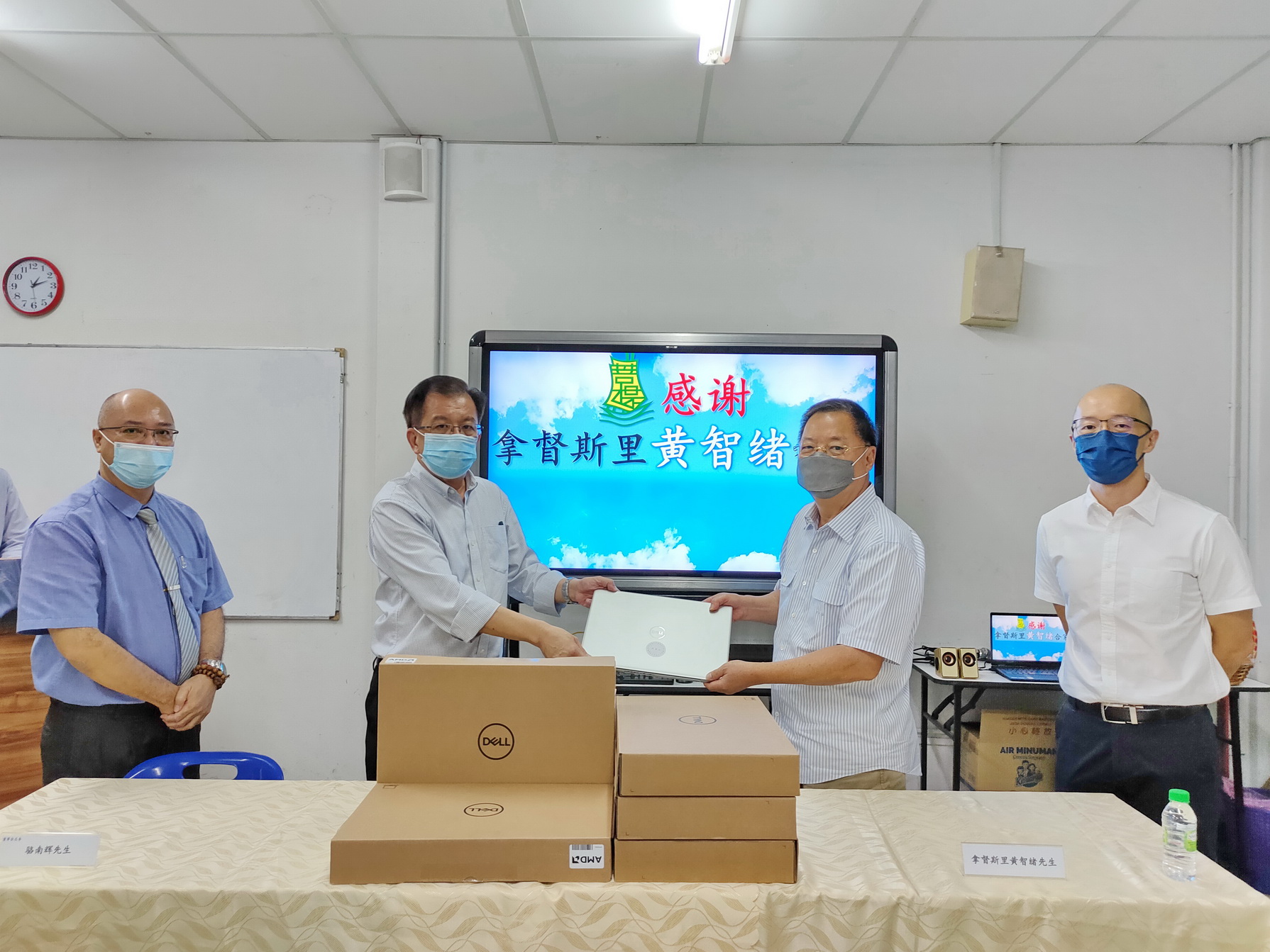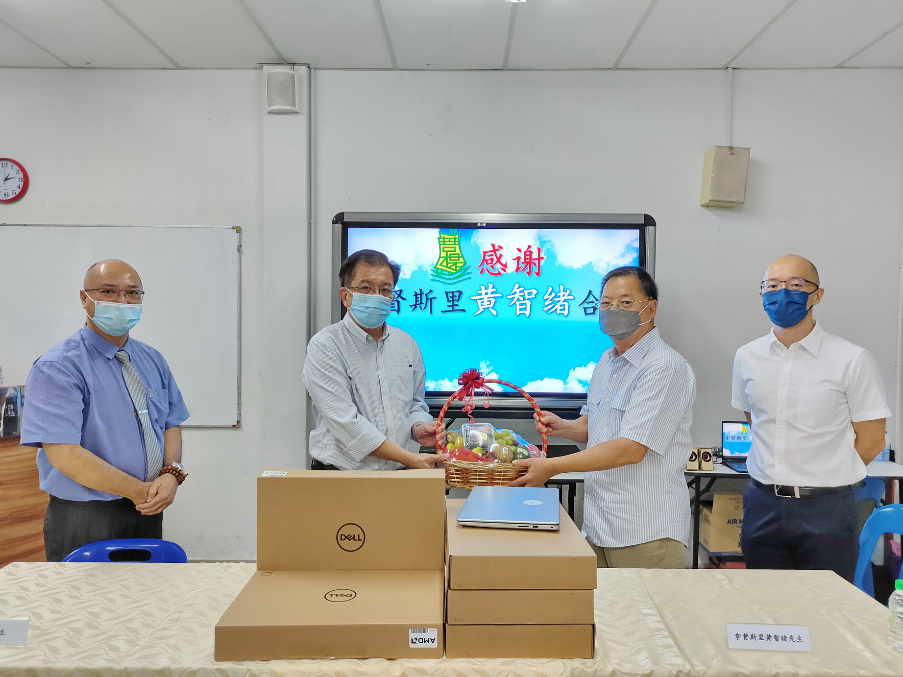拿督斯里黄智绪合家(Thye Huat Chan Sdn Bhd 捐赠10台及Just IMEX Sdn Bhd 捐赠8 台)捐赠的手提电脑由菩提四校董事会总务骆南辉先生接领。此18台手提电脑将给予本校清寒子弟作网上学习用途。