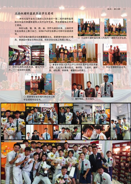 〇  中学生涯的点点滴滴,都化作照                     合照。左起为庄意添校长、蔡煜智、王品权、谢昕                            〇  毕业生领取毕业证书。