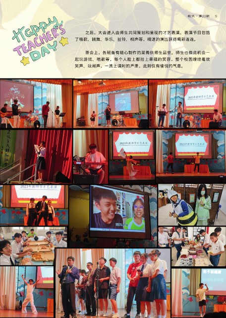 校讯·第23期 5 之后,大会进入由师生共同策划和呈现的才艺表演。表演节目包括 了唱歌、跳舞、华乐、扯铃、相声等,精湛的演出获得喝彩连连。 茶会上,各班备有精心制作的菜肴供师生品尝。师生也借此机会一 起玩游戏、唱歌等,每个人脸上都挂上幸福的笑容,整个校园缭绕着欢 笑声、玩闹声,一洗上课时的严肃,此刻仅有愉悦的气息。