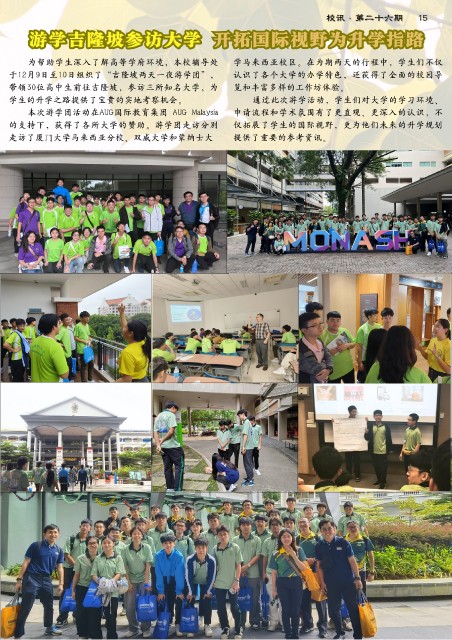 于12月9日至10日组织了“吉隆坡两天一夜游学团”,                                 认识了各个大学的办学特色,还获得了全面的校园导