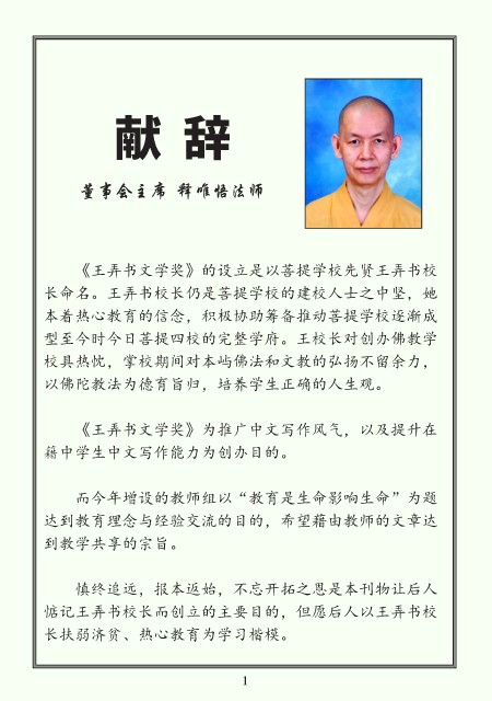 《王弄书文学奖》的设立是以菩提学校先贤王弄书校