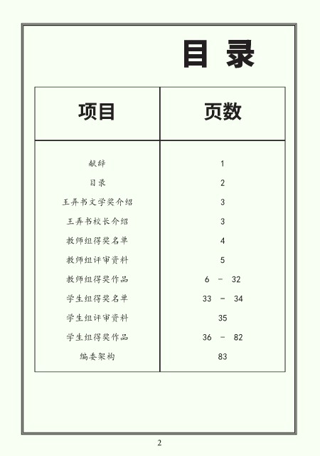 目 录 项目 页数 献辞 1 目录 2 王弄书文学奖介绍 3 王弄书校长介绍 3 教师组得奖名单 4 教师组评审资料 5 教师组得奖作品 6 - 32 学生组得奖名单 33 - 34 学生组评审资料 35 学生组得奖作品 36 - 82 编委架构 83 2