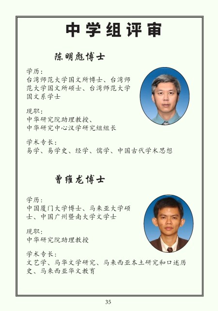 中学组评审 陈明彪博士 学历: 台湾师范大学国文所博士、台湾师 范大学国文所硕士、台湾师范大学 国文系学士 现职: 中华研究院助理教授、 中华研究中心汉学研究組組长 学术专长: 易学、易学史、经学、儒学、中国古代学术思想 曾维龙博士 学历: 中国厦门大学博士、马来亚大学硕 士、中国广州暨南大学文学士 现职: 中华研究院助理教授 学术专长: 文艺学、马华文学研究、马来西亚本土研究和口述历 史、马来西亚华文教育 35
