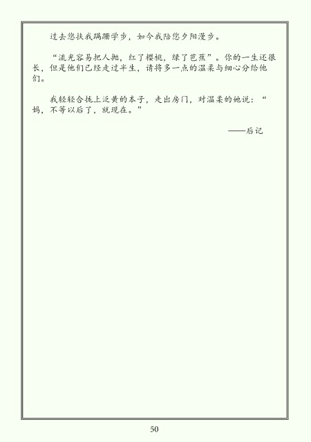 过去您扶我蹒跚学步,如今我陪您夕阳漫步。 “流光容易把人抛,红了樱桃,绿了芭蕉”。你的一生还很 长,但是他们已经走过半生,请将多一点的温柔与细心分给他 们。 我轻轻合拢上泛黄的本子,走出房门,对温柔的她说:“ 妈,不等以后了,就现在。” ——后记 50