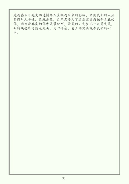 是这些不可避免的遗憾给人生轨迹带来的影响,才使我们的人生 变得耐人寻味。你就是你,你不需要为了追求完美而抛弃真正的 你,因为最真实的你才是最特别,最美的。完整不一定是完美, 而残缺也有可能是完美,用心体会,真正的完美就在我们的心 中。 71