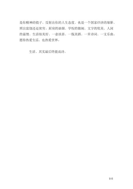 是你精神的镜⼦,反射出你的⼈⽣态度,也是⼀个国家经济的缩影, 照出富饶还是贫穷。厨房的油烟,学校的嬉闹,⽂字的优美,⼈间 的温情,⽣活很美好,⼀壶淡茶,⼀瓶美酒,⼀⾸诗词,⼀⽀乐曲。 愿你热爱⽣活,也热爱世界。 ⽣活,其实最后终能成诗。 101