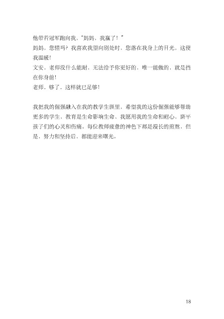 他带着冠军跑向我,“妈妈,我赢了!” 妈妈,您懂吗?我喜欢我望向别处时,您落在我⾝上的⽬光,这使 我温暖! ⽂安,⽼师没什么能耐,⽆法给予你更好的,唯⼀能做的,就是挡 在你⾝前! ⽼师,够了,这样就已⾜够! 我把我的倔强融⼊在我的教学⽣涯⾥,希望我的这份倔强能够帮助 更多的学⽣,教育是⽣命影响⽣命,我愿⽤我的⽣命和耐⼼,磨平 孩⼦们的⼼灵和伤痛。每位教师疲惫的神⾊下都是漫长的煎熬,但 是,努⼒和坚持后,都能迎来曙光。 18