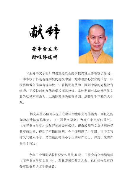 《王弄书⽂学奖》的设⽴是以菩提学校先贤王弄书校长命名。