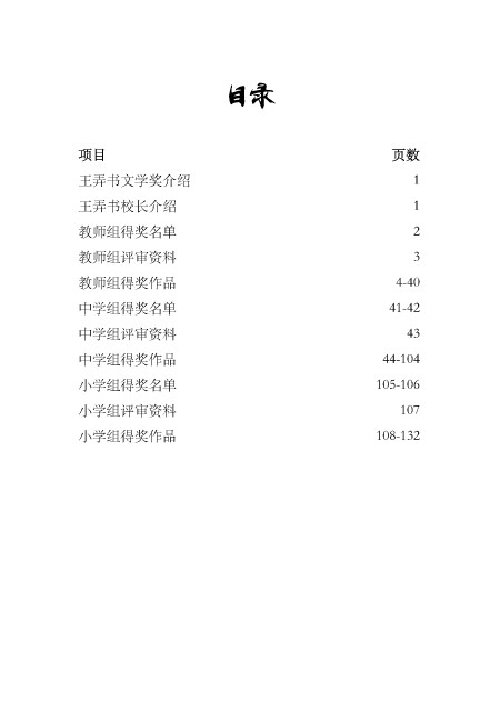 目录 项⽬ 页数 王弄书⽂学奖介绍 1 王弄书校长介绍 1 教师组得奖名单 2 教师组评审资料 3 教师组得奖作品 4-40 中学组得奖名单 41-42 中学组评审资料 43 中学组得奖作品 44-104 ⼩学组得奖名单 105-106 ⼩学组评审资料 107 ⼩学组得奖作品 108-132