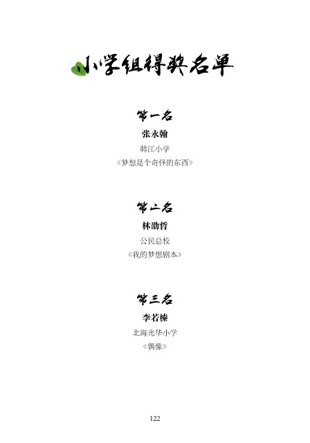 小学组得奖名单 第一名 张永翰 韩江⼩学 《梦想是个奇怪的东西》 第二名 林劭哲 公民总校 《我的梦想剧本》 第三名 李若榛 北海光华⼩学 《偶像》 122