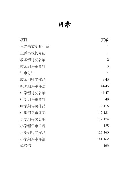 目录 项⽬ 页数 王弄书⽂学奖介绍 1 王弄书校长介绍 1 教师组得奖名单 2 教师组评审资料 3 评审总评 4 教师组得奖作品 5-43 教师组评审评语 44-45 中学组得奖名单 46-47 中学组评审资料 48 中学组得奖作品 49-116 中学组评审评语 117-121 ⼩学组得奖名单 122-124 ⼩学组评审资料 125 ⼩学组得奖作品 126-160 ⼩学组评审评语 161-162 编后语 163