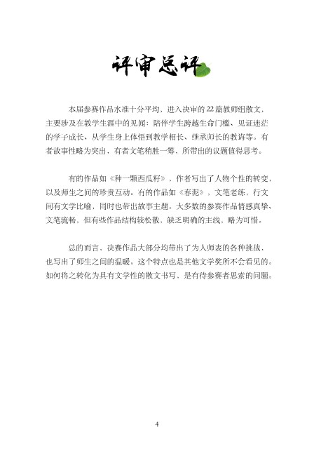 本届参赛作品⽔准⼗分平均,进⼊决审的 22 篇教师组散⽂,