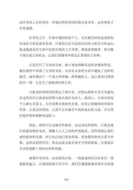 伤害。正是这些离别,让我学会在痛苦中找到成长的⼒量,学会更
