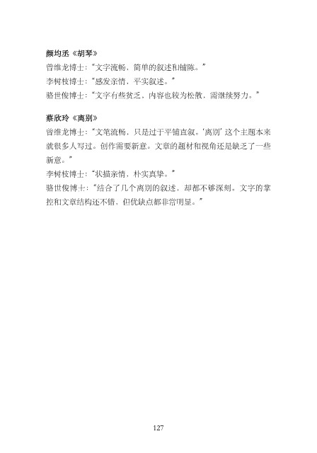颜均丞《胡琴》 曾维龙博⼠:“⽂字流畅,简单的叙述和铺陈。” 李树枝博⼠:“感发亲情,平实叙述。” 骆世俊博⼠:“⽂字有些贫乏,内容也较为松散,需继续努⼒。” 蔡欣玲《离别》 曾维龙博⼠:“⽂笔流畅,只是过于平铺直叙。‘离别’ 这个主题本来 就很多⼈写过。创作需要新意。⽂章的题材和视⾓还是缺乏了⼀些 新意。” 李树枝博⼠:“状描亲情,朴实真挚。” 骆世俊博⼠:“结合了⼏个离别的叙述,却都不够深刻。⽂字的掌 控和⽂章结构还不错,但优缺点都⾮常明显。” 127