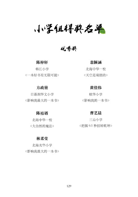 小学组得奖名单 优秀奖 陈梓轩 翁颖涵 韩江⼩学 北海中华⼀校 《⼀本好书有⽆限可能》 《天空是晴朗的》 方政量 黄佳伟 ⽇落洞华⽂⼩学 槟华⼩学 《影响我最⼤的⼀本书》 《影响我的⼀本书》 陈褣谞 曹艺晨 北海中华⼀校 三⼭⼩学 《⼤⾃然的魔法》 《把握 0.1 秒扭转乾坤》 林柔莹 北海光华⼩学 《影响我最⼤的⼀本书》 129