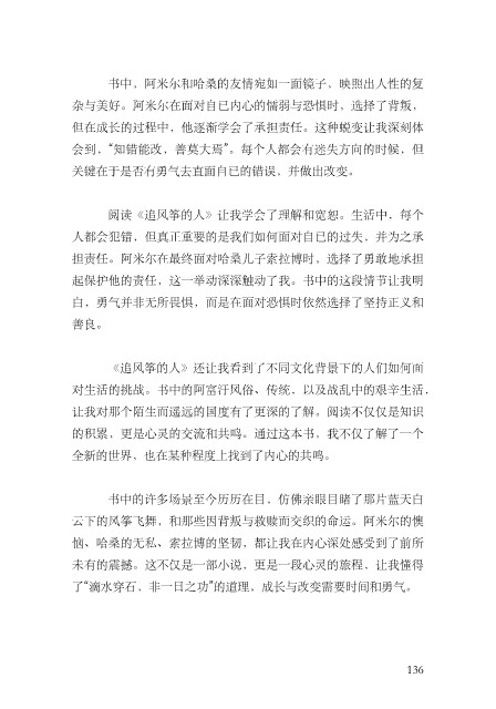 阅读《追风筝的⼈》让我学会了理解和宽恕。⽣活中,每个