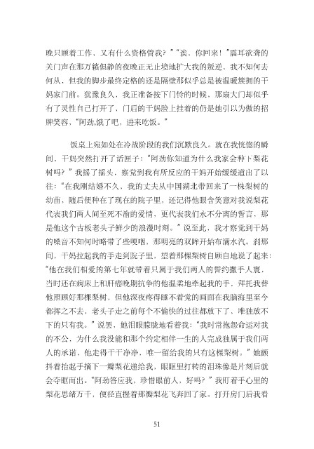 ⼈的承诺,他⾛得⼲⼲净净,唯⼀留给我的只有这棵梨树。” 她颤