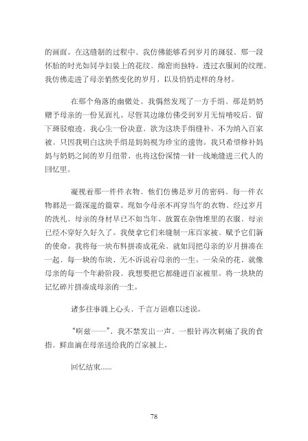 的使命。我将每⼀块布料拼凑成花朵,就如同把母亲的岁⽉拼凑在