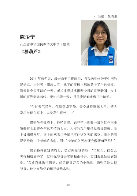 奶奶⾝边,扯着她的⾐⾓,问:“今年的冬天您还会做糖葫芦吗?”