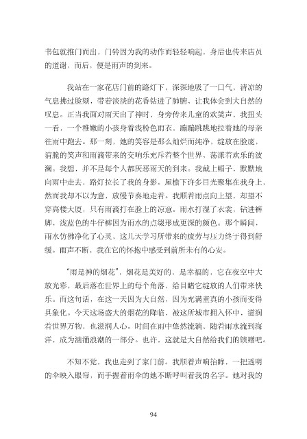 ⾬⽔仿佛净化了⼼灵,这⼏天学习所带来的疲劳与压⼒终于得到舒