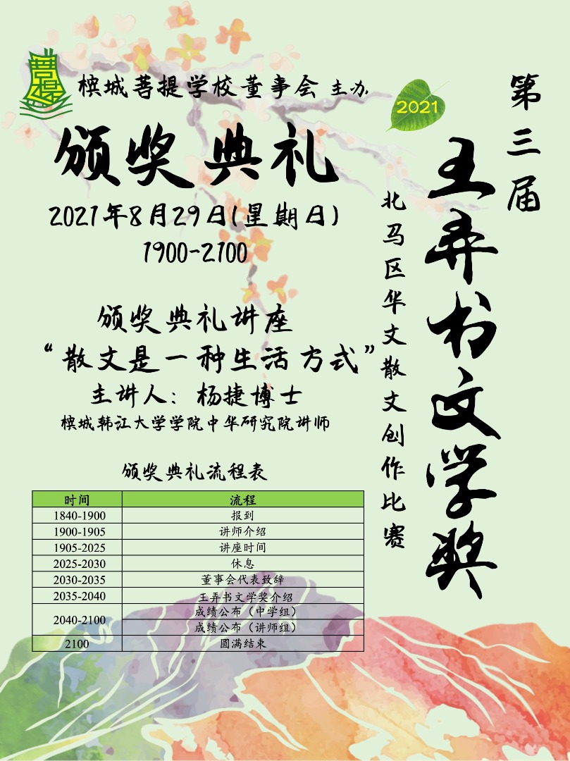 2021 年第三届王弄书文学奖颁奖典礼订于8月29日(星期日)晚上7点正线上举行。