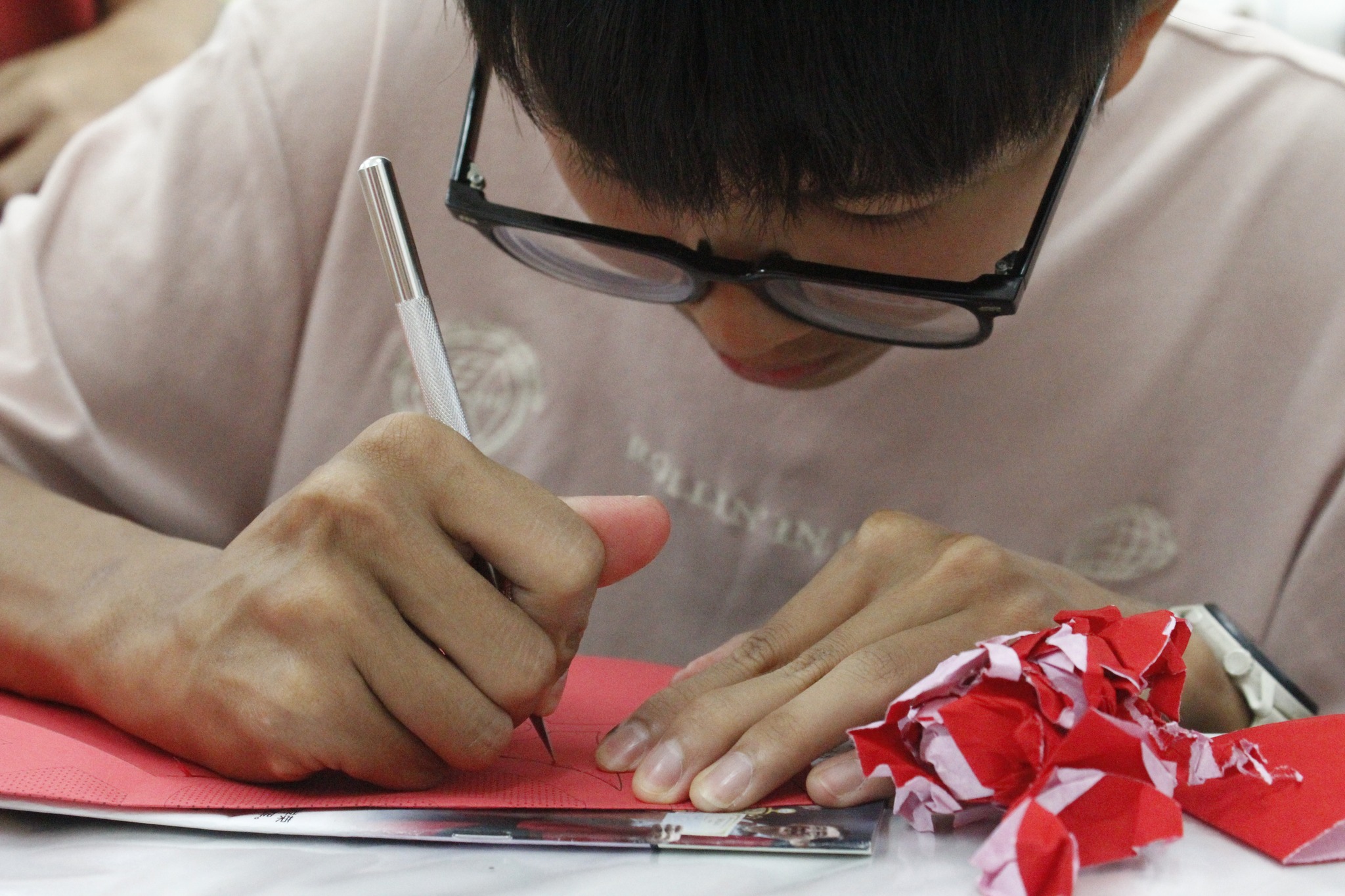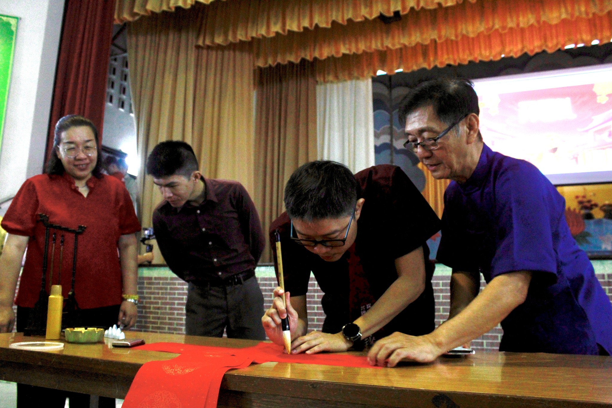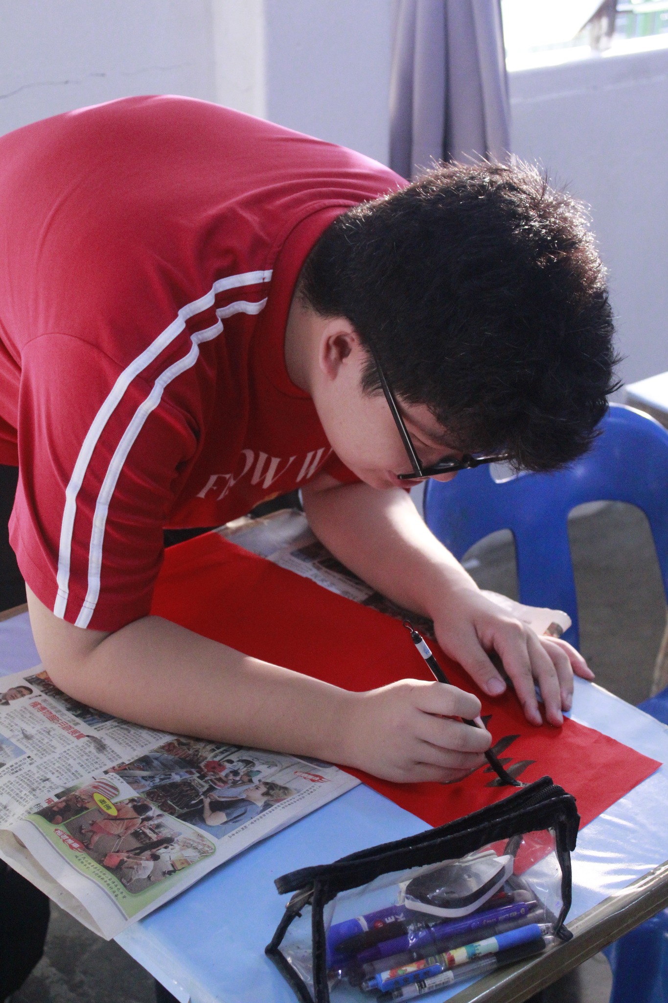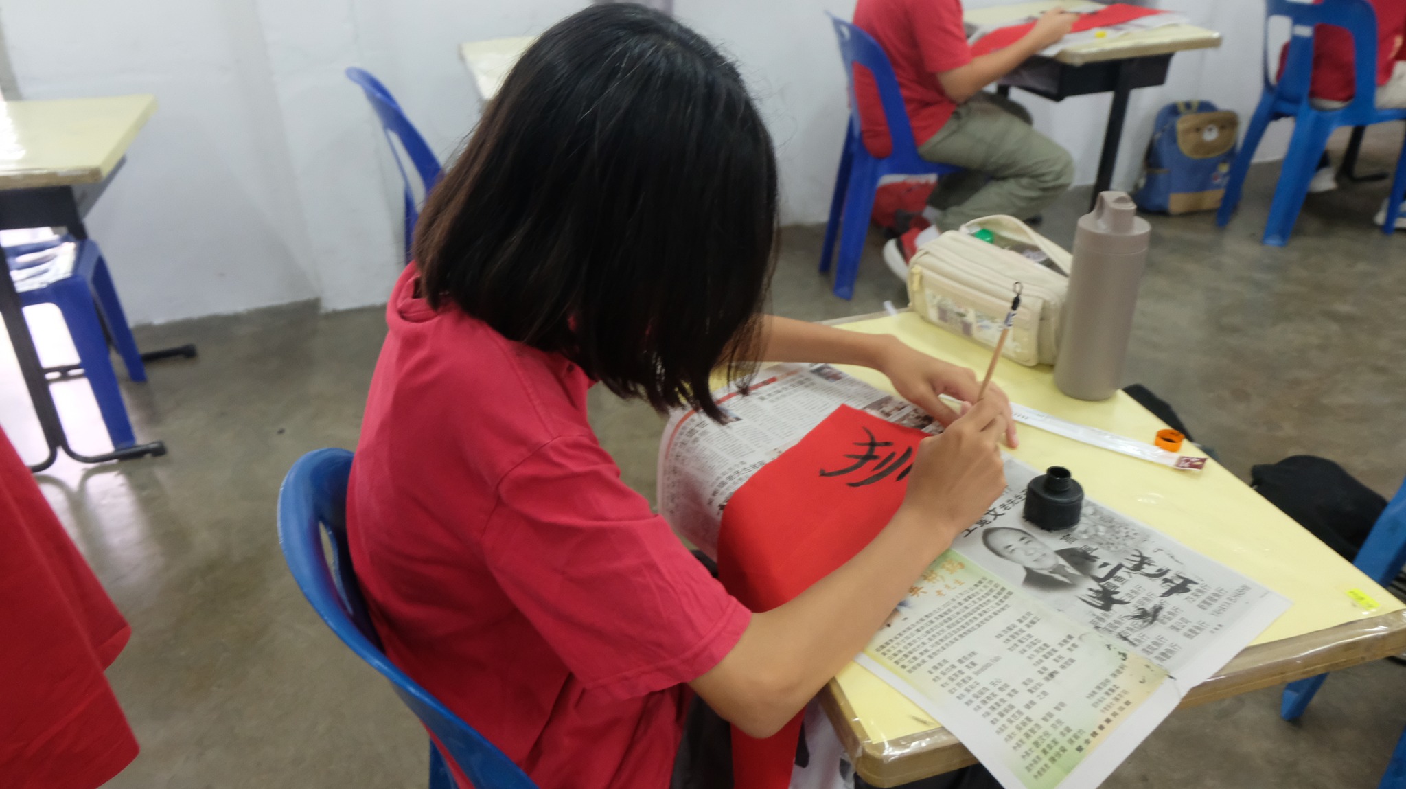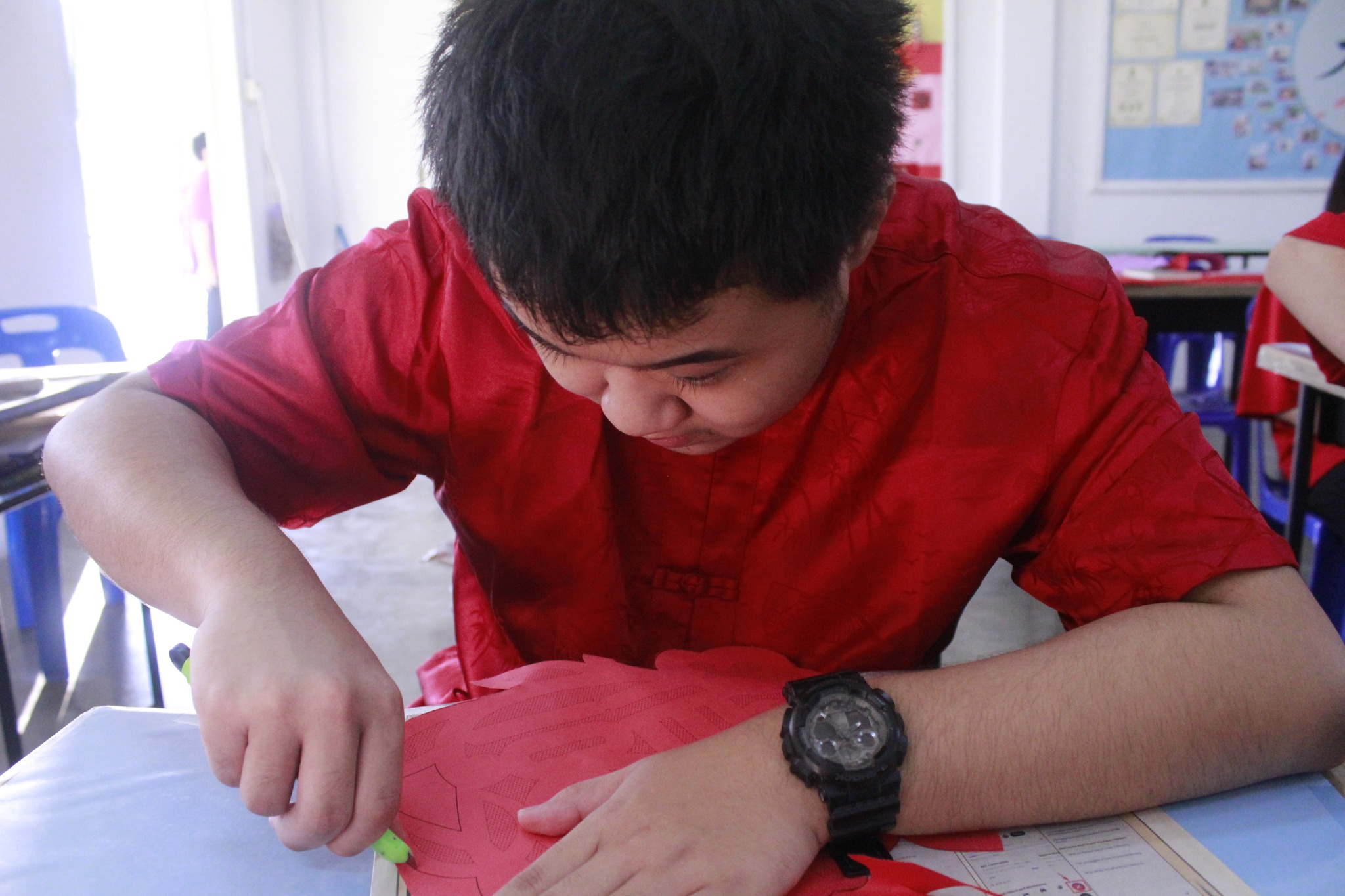 开笔礼由书法老师骆子耀老师主持,“龙腾盛世鼓迎喜,骏瑞盈门狮送福”,一笔一画间都寄托着对新年的美好期许。随后进行的挥春比赛与剪纸比赛在各班教室同步展开。挥毫泼墨,红纸翻飞,创作出一幅幅寓意吉祥的春联及图案,更增校园喜气。