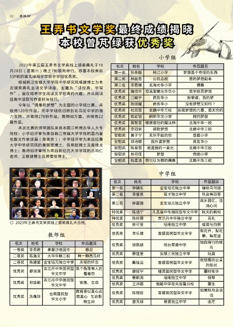 2023年第五届王弄书文学奖线上颁奖典礼于10 名次 姓名 学校 作品题目