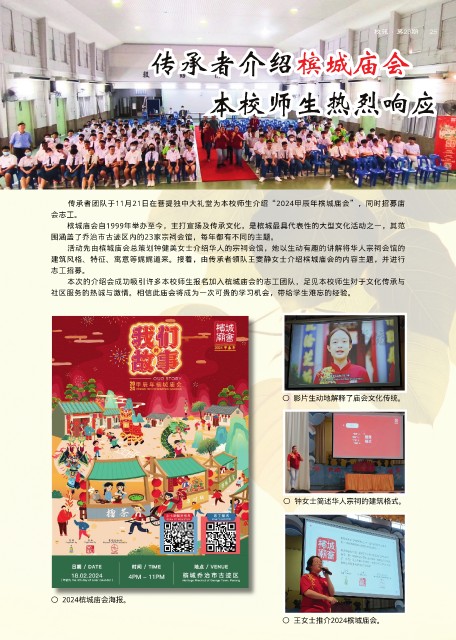 传承者团队于11月21日在菩提独中大礼堂为本校师生介绍“2024甲辰年槟城庙会”,同时招募庙