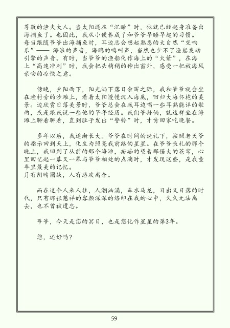 海捕鱼了。也因此,我从小便养成了和爷爷早睡早起的习惯。