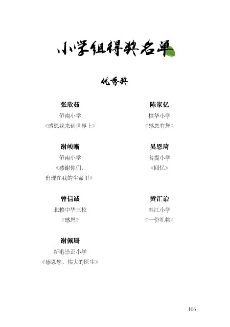小学组得奖名单 优秀奖 张欣茹 陈家亿 侨南⼩学 槟华⼩学 《感恩我来到世界上》 《感恩有您》 谢峻晰 吴恩琦 侨南⼩学 菩提⼩学 《感谢你们, 《回忆》 出现在我的⽣命⾥》 曾信诚 黄汇诒 北赖中华三校 韩江⼩学 《感恩》 《⼀份礼物》 谢佩珊 新港崇正⼩学 《感恩您,伟⼤的医⽣》 106