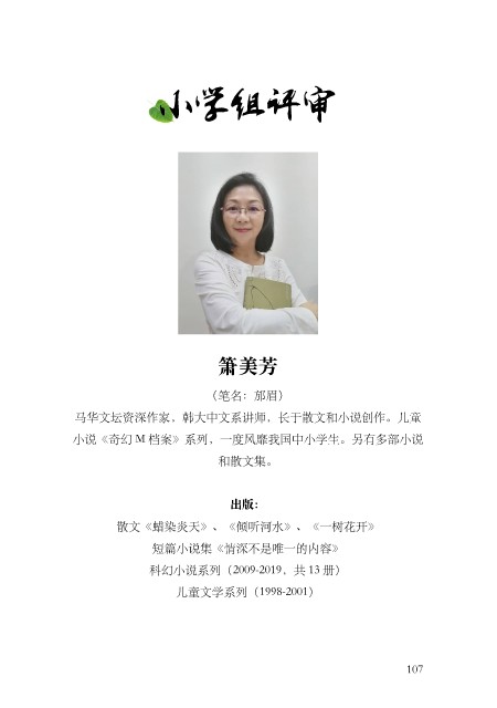 小学组评审 箫美芳 (笔名:邡眉) 马华⽂坛资深作家,韩⼤中⽂系讲师,长于散⽂和⼩说创作。⼉童 ⼩说《奇幻 M 档案》系列,⼀度风靡我国中⼩学⽣。另有多部⼩说 和散⽂集。 出版: 散⽂《蜡染炎天》、《倾听河⽔》、《⼀树花开》 短篇⼩说集《情深不是唯⼀的内容》 科幻⼩说系列(2009-2019,共 13 册) ⼉童⽂学系列(1998-2001) 107