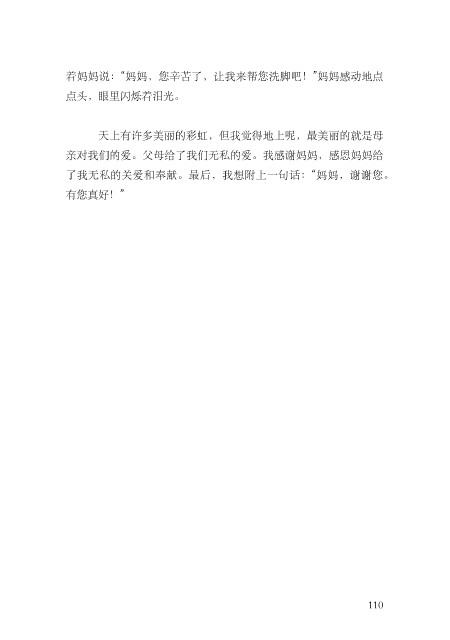 着妈妈说:“妈妈,您⾟苦了,让我来帮您洗脚吧!”妈妈感动地点 点头,眼⾥闪烁着泪光。 天上有许多美丽的彩虹,但我觉得地上呢,最美丽的就是母 亲对我们的爱。⽗母给了我们⽆私的爱。我感谢妈妈,感恩妈妈给 了我⽆私的关爱和奉献。最后,我想附上⼀句话:“妈妈,谢谢您。 有您真好!” 110