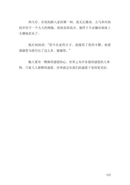两天后,在妈妈踏⼊家的那⼀刻,我⽆⽐激动,⽴马奔向妈 妈并给予⼀个⼤⼤的拥抱。妈妈也很⾼兴,她终于不必躺在病床上 ⽆聊地发呆了。 我对妈妈说:“您不在家的⽇⼦,我懂得了您的⾟勤。我要 感谢您为我付出了这么多,谢谢您。” 做⼈要有⼀颗懂得感恩的⼼,世界上有许多值得感恩的⼈事 物,只要⼈⼈都懂得感恩,世界就会在我们的感恩下变得更美好。 122