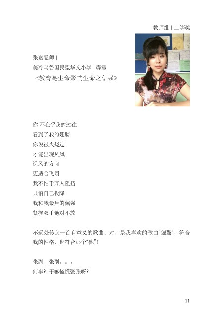 教师组 | ⼆等奖 张嘉雯师 | 美冷乌鲁国民型华⽂⼩学| 霹雳 《教育是⽣命影响⽣命之倔强》 你 不在乎我的过往 看到了我的翅膀 你说被⽕烧过 才能出现凤凰 逆风的⽅向 更适合飞翔 我不怕千万⼈阻挡 只怕⾃⼰投降 我和我最后的倔强 紧握双⼿绝对不放 不远处传来⼀⾸有意义的歌曲,对,是我喜欢的歌曲“倔强”,符合 我的性格,也符合那个“他”! 张副,张副。。。 何事?⼲嘛慌慌张张呀? 11