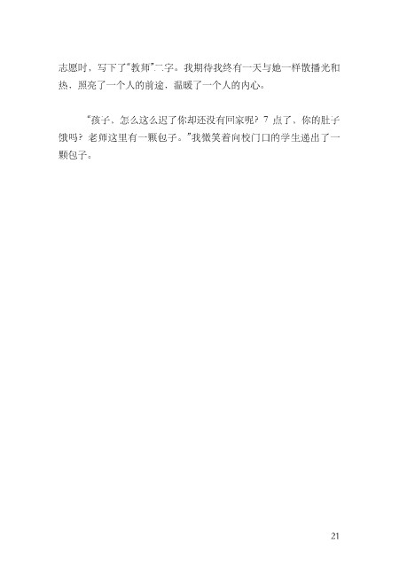 志愿时,写下了“教师”⼆字。我期待我终有⼀天与她⼀样散播光和 热,照亮了⼀个⼈的前途,温暖了⼀个⼈的内⼼。 “孩⼦,怎么这么迟了你却还没有回家呢?7 点了,你的肚⼦ 饿吗?⽼师这⾥有⼀颗包⼦。”我微笑着向校门⼜的学⽣递出了⼀ 颗包⼦。 21