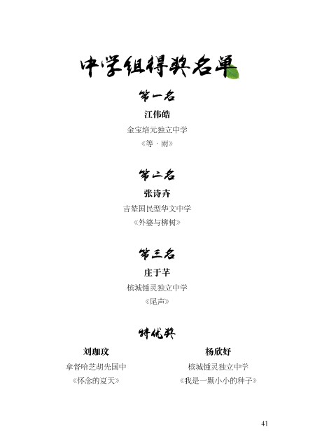 中学组得奖名单 第一名 江伟皓 ⾦宝培元独⽴中学 《等·⾬》 第二名 张诗卉 吉辇国民型华⽂中学 《外婆与柳树》 第三名 庄于芊 槟城锺灵独⽴中学 《尾声》 特优奖 刘珈玟 杨欣妤 拿督哈芝胡先国中 槟城锺灵独⽴中学 《怀念的夏天》 《我是⼀颗⼩⼩的种⼦》 41