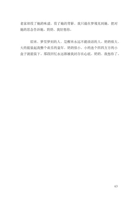 ⽼家却没了她的味道,没了她的背影,我只能在梦境见到她,把对 她的思念告诉她。奶奶,我好想你。 原来,梦⾥梦到的⼈,是醒来永远不能说话的⼈。奶奶很⼤, ⼤的能装起我整个欢乐的童年,奶奶很⼩,⼩的连个四四⽅⽅的⼩ 盒⼦就能装下。那段回忆永远都被我封存在⼼底。奶奶,我想你了。 63