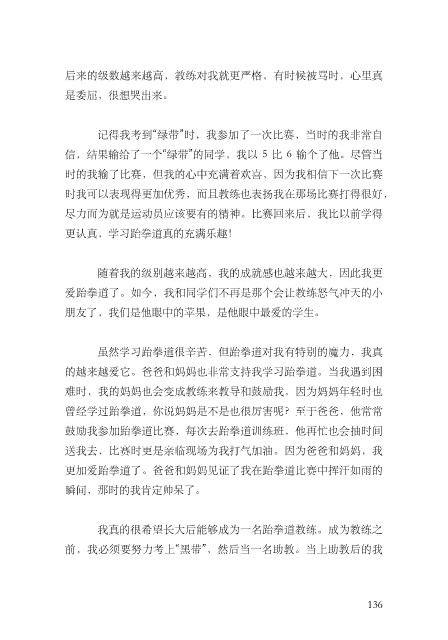 的越来越爱它。爸爸和妈妈也⾮常⽀持我学习跆拳道。当我遇到困