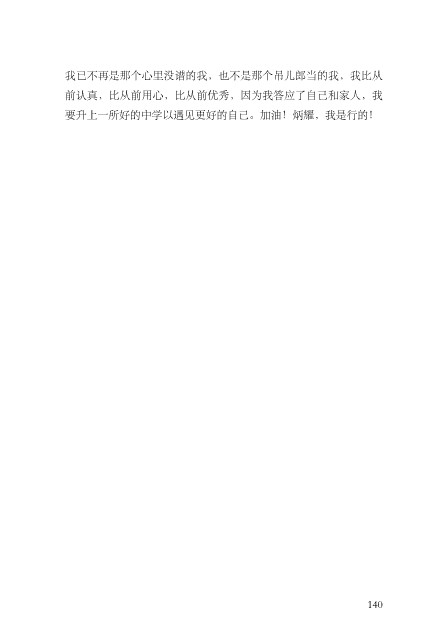 我已不再是那个⼼⾥没谱的我,也不是那个吊⼉郎当的我,我⽐从 前认真,⽐从前⽤⼼,⽐从前优秀,因为我答应了⾃⼰和家⼈,我 要升上⼀所好的中学以遇见更好的⾃⼰。加油!炳耀,我是⾏的! 140